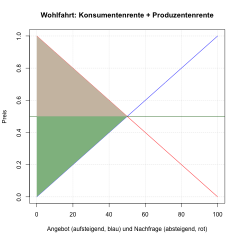 Die Gesamtwohlfahrt ist in der Grafik die gesamte eingefärbte Fläche (die Konsumentenrente ist die obere Dreiecksfläche, die Produzentenrente die untere Dreiecksfläche):